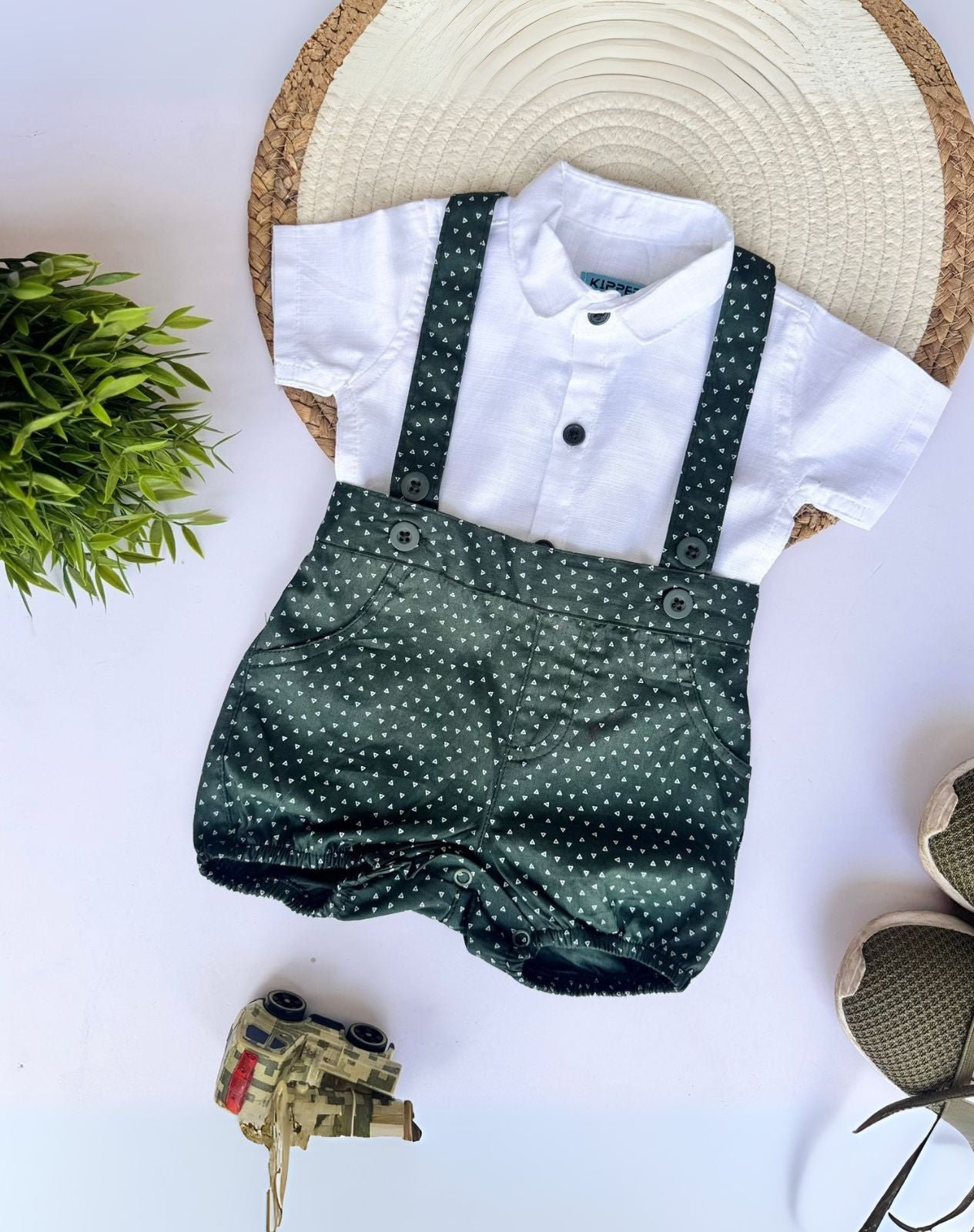 Dress your little one in charm and comfort with this stylish boys’ dungaree set. Featuring a crisp white short-sleeve shirt paired with a maroon polka dot dungaree, this outfit is perfect for both casual outings and special occasions.